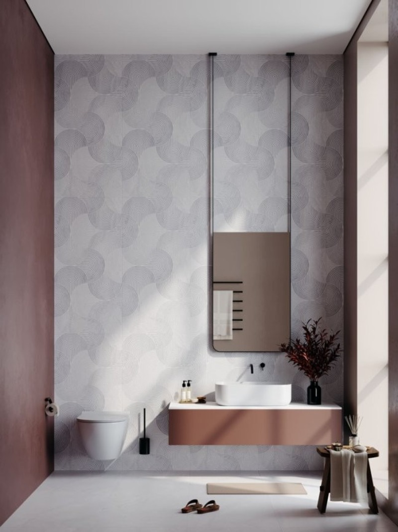 Với khổ gạch lớn có họa tiết hình học, hoa văn nổi bật hoặc hiệu ứng vân nổi tinh xảo, dòng gạch này mang đến chiều sâu và sức sống mới cho căn phòng. Chỉ cần ốp nhấn một mảng nhỏ như khu vực bồn rửa hay vách tắm đứng, toàn bộ không gian đã trở nên sang trọng, cá tính và đậm dấu ấn riêng.