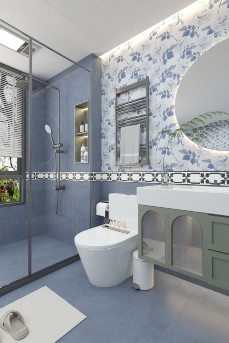 - 3. Phối màu gạch ốp tường xanh dương hài hòa với nền nhà và thiết bị nội thất