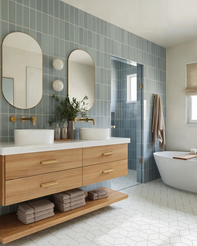Gạch ốp tường xanh dương phát huy thẩm mỹ tốt nhất khi đi cùng nền nhà tông trung tính như trắng, kem, be, xám nhạt hoặc sàn gỗ. Đồng thời, các thiết bị nội thất và thiết bị vệ sinh màu trắng, kim loại sáng sẽ giúp tổng thể không gian gọn gàng và cao cấp hơn.