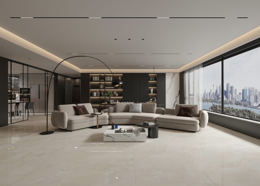 Phòng khách phong cách Hiện đại tập trung vào sự gọn gàng, tối ưu công năng sử dụng, giúp phòng khách luôn thông thoáng và tiện nghi. Đồ trang trí phòng khách hiện đại không quá cầu kỳ, thường là tranh treo tường trừu tượng, đèn trang trí thiết kế đơn giản, thảm trải sàn họa tiết nhẹ hoặc gương trang trí dáng tối giản kết hợp với nền tông màu xám, trắng, be trung tính từ gạch lát nền và gạch ốp tường.