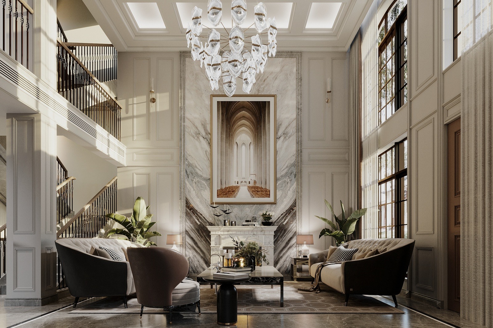 Khi trang trí nội thất phòng khách Tân cổ điển, màu sắc thường là các gam trang nhã như trắng kem, be, xám nhạt, kết hợp với ánh kim nhẹ hoặc chi tiết mạ vàng tinh tế. Đồ trang trí phòng khách có thiết kế mềm mại hơn, thường là gương trang trí viền kim loại, đèn chùm, đèn tường, tranh treo tường khung lớn hoặc các món decor có tính đối xứng cao.