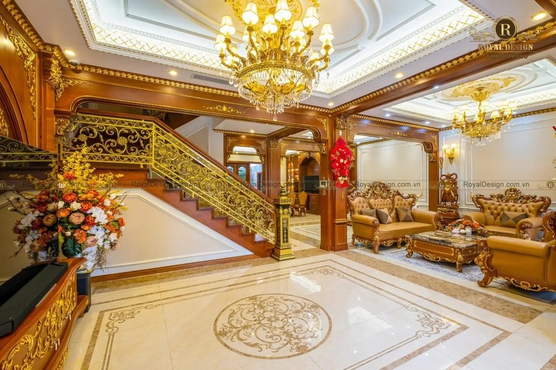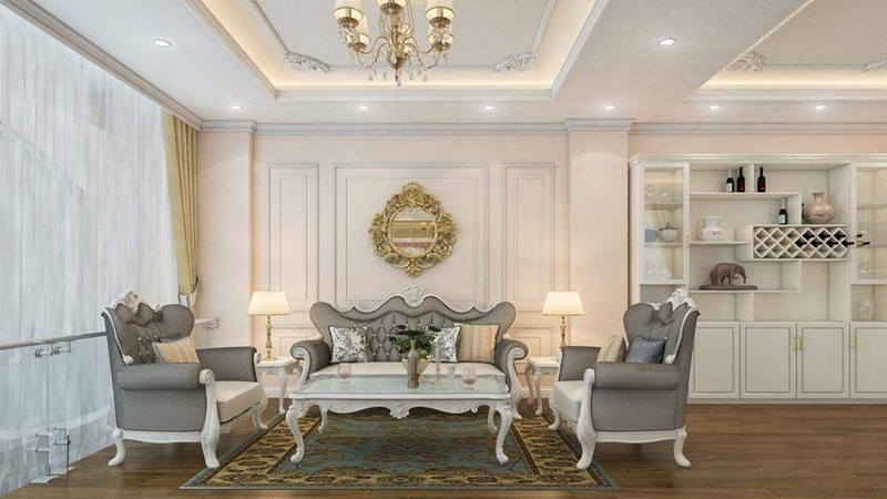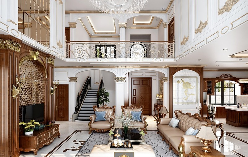Nội thất trong phòng khách Tân cổ điển mang đường nét mềm mại, trang nhã với chất liệu da, gỗ tự nhiên, kim loại mạ vàng hoặc đồng. Chính sự kết hợp giữa nội thất cao cấp và nền gạch sang trọng tạo nên tổng thể hài hòa, thể hiện gu thẩm mỹ tinh tế và niềm tự hào của chủ sở hữu.