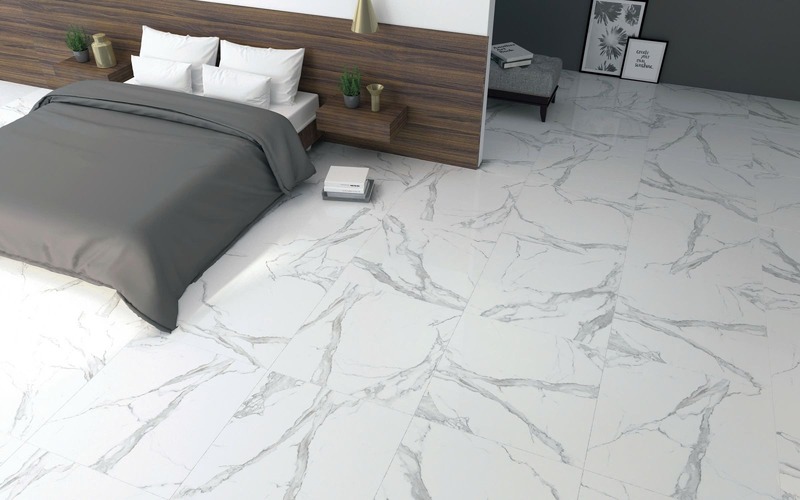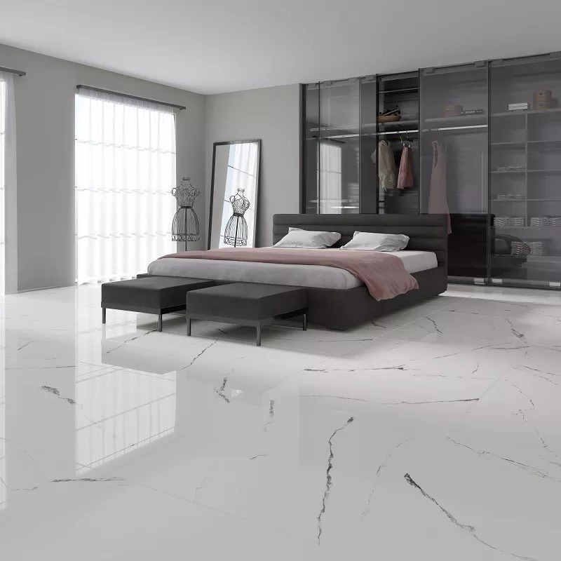 Gạch vân đá lát nền phòng ngủ mang đến cảm giác thanh lịch và sang trọng cho phòng ngủ biệt thự. Các dòng gạch vân đá marble nhập khẩu thường sở hữu đường vân mảnh, tông màu nhẹ và bề mặt mượt như tơ, tạo nên vẻ đẹp sang trọng nhưng không lạnh lẽo nhờ bề mặt mờ hoặc satin mềm mại. Các mẫu gạch tông màu be, kem ấm, trắng khói…mang đến sự thư giãn tuyệt đối, phù hợp cho phòng ngủ hiện đại.