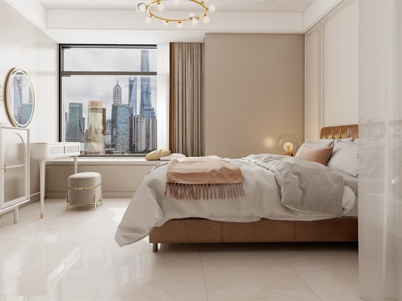 Phòng ngủ cần sự dịu mắt hơn so với phòng khách hay bếp, vì vậy gạch không nên quá bóng hoặc có họa tiết phức tạp. Bề mặt mờ nhẹ là lựa chọn phù hợp nhất vì giữ được vẻ sang trọng nhưng không gây cảm giác lạnh lẽo.