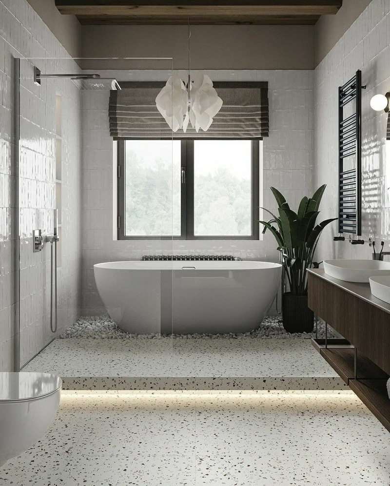 Xu hướng thiết kế này đề cao tính thư giãn và trải nghiệm cá nhân. Bồn tắm độc lập thường là cạnh cửa sổ nhìn ra vườn hoặc trong khu vực lộ thiên có mái che là một điểm nhấn xa hoa. Việc bố trí nội thất và gạch ốp lát tạo ra một không gian giống như spa tại gia, nâng cao sự thoải mái và chất lượng sống.