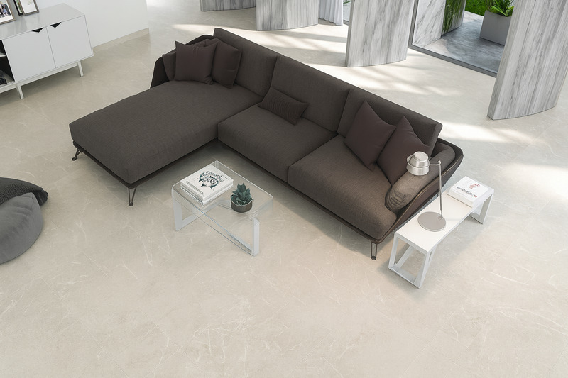Gạch lát nền vân đá là dòng kinh điển nhất, không bao giờ lỗi thời theo thời gian. Với phòng khách nhỏ, nên chọn vân đá nhẹ, tone sáng như trắng khói, be hoặc xám ghi để giúp không gian rộng thoáng hơn, tránh cảm giác nặng nề.