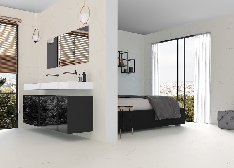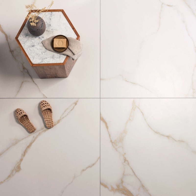 Vẻ đẹp của cẩm thạch trắng được tái hiện rõ ràng trên bề mặt gạch khổ lớn 90x90cm. Đường vân mảnh, sắc nét khiến không gian bừng sáng, tăng chiều sâu và sự tinh khiết, là lựa chọn hoàn hảo cho nội thất tối giản và hiện đại.