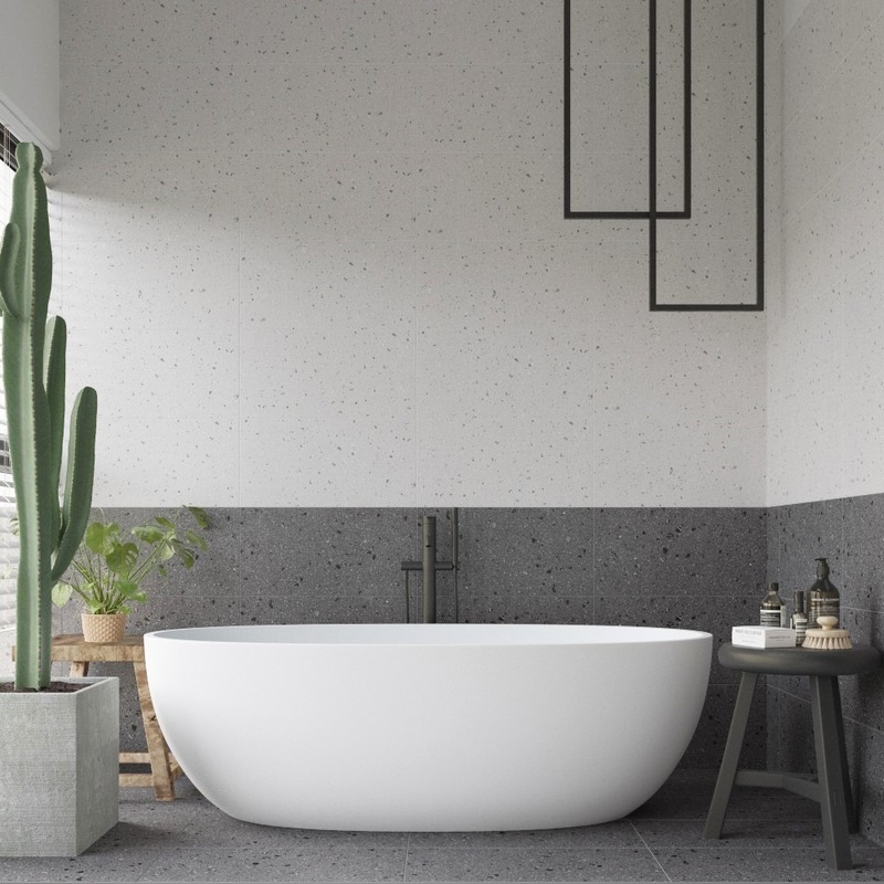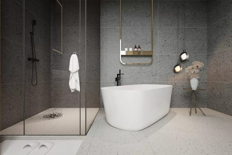 Nếu trước đây nhiều gia chủ e dè vì màu sắc đa hạt của các mẫu Terrazzo đã được tiết chế để phù hợp hơn với phong cách sang trọng của biệt thự. Gạch vân Terrazzo với hạt đá granite mịn, màu nhẹ nhàng như xám, trắng kem hoặc be tạo nên điểm nhấn tinh tế mà không phá vỡ tổng thể phòng tắm. Những gia chủ trẻ hoặc nhà có con nhỏ đặc biệt yêu thích dòng gạch này vì nó mang cảm giác nghệ thuật, tươi mới và mang đến không gian tắm đầy cảm hứng.