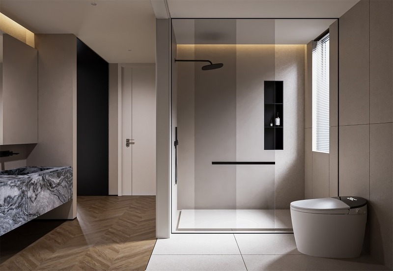 Một số chủ biệt thự trẻ đang ưa chuộng phòng tắm mở, liền với phòng ngủ hoặc dùng kính điện thông minh. Thiết kế này giúp không gian rộng hơn, sang hơn và mang lại cảm giác phóng khoáng. Gạch nền vì vậy cần tone màu nhẹ, dễ phối và chống trượt tốt để đảm bảo an toàn.