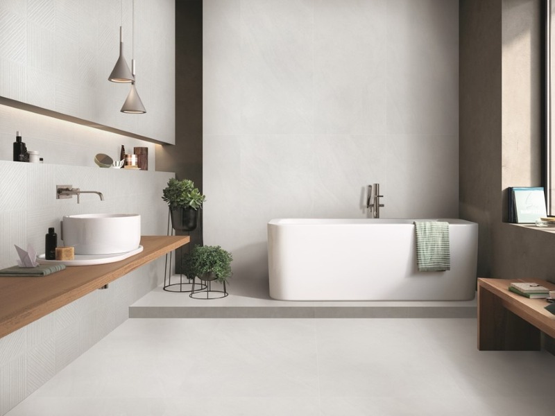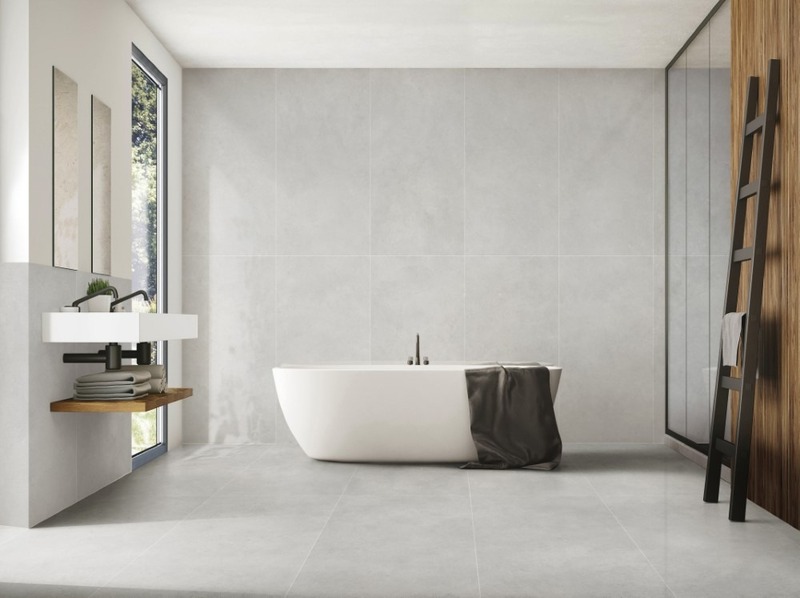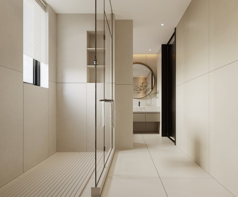 Trong các thiết kế biệt thự hiện đại, gam màu trung tính luôn là lựa chọn hàng đầu vì mang lại cảm giác thư giãn và sang trọng. Những mẫu gạch lát nền tông trắng, xám và kem,... làm nổi bật thiết bị vệ sinh cao cấp, đồng thời dễ phối phù hợp với mọi phong cách nội thất trong biệt thự.