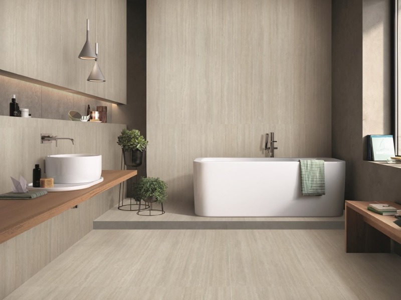 - Phòng tắm trung bình – lớn: Có thể lựa chọn gạch 60x60 hoặc 60x120 vân đá, vân gỗ bề mặt nhám nhẹ cao cấp không chỉ bền chắc, chống trơn tốt mà còn mang lại vẻ sang trọng, hiện đại cho tổng thể phòng tắm.