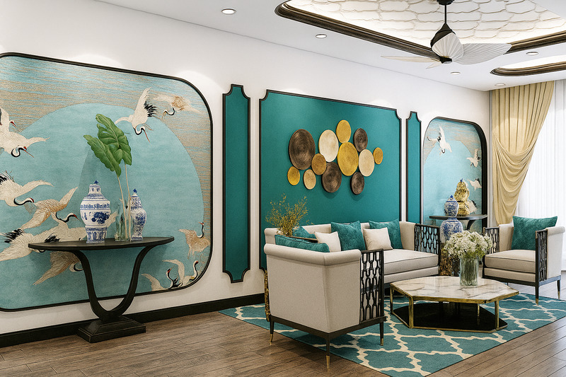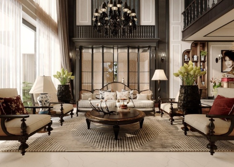 Khi bước vào một phòng khách đẹp chuẩn Đông Dương, người ta dễ nhận thấy sự hòa quyện của gam màu trầm ấm, những họa tiết hình học đậm dấu ấn Á Đông hay nét mộc mạc phảng phất từ vật liệu tự nhiên: