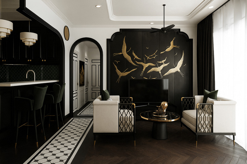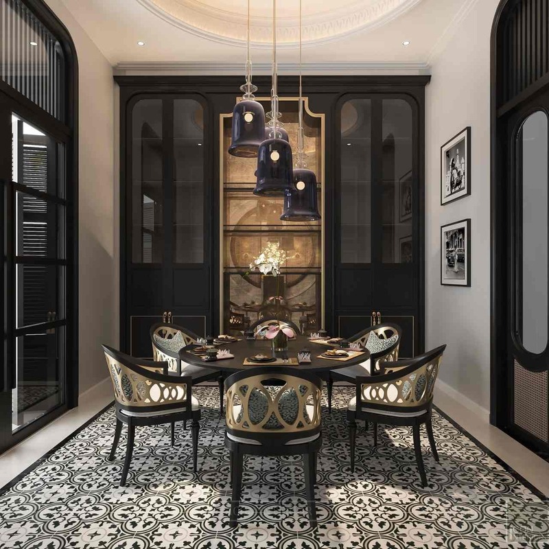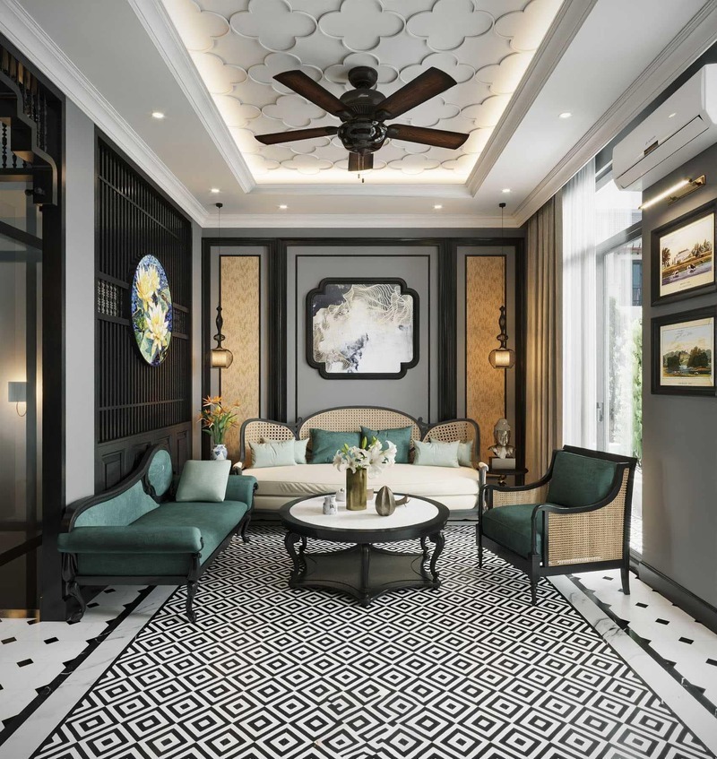 Gạch họa tiết đen trắng là lựa chọn không thể thiếu nếu anh chị muốn tạo điểm nhấn mạnh mẽ cho phòng khách biệt thự Indochine. Tông đen trắng mang tinh thần tối giản nhưng đầy cá tính, kết hợp hoàn hảo với nội thất gỗ nâu sậm, quạt trần, cửa vòm và các chi tiết mang bản sắc Đông Dương.