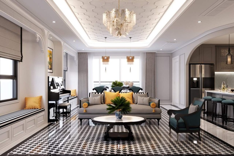 2. Phối màu gạch lát nền chuẩn Indochine cho phòng khách biệt thự