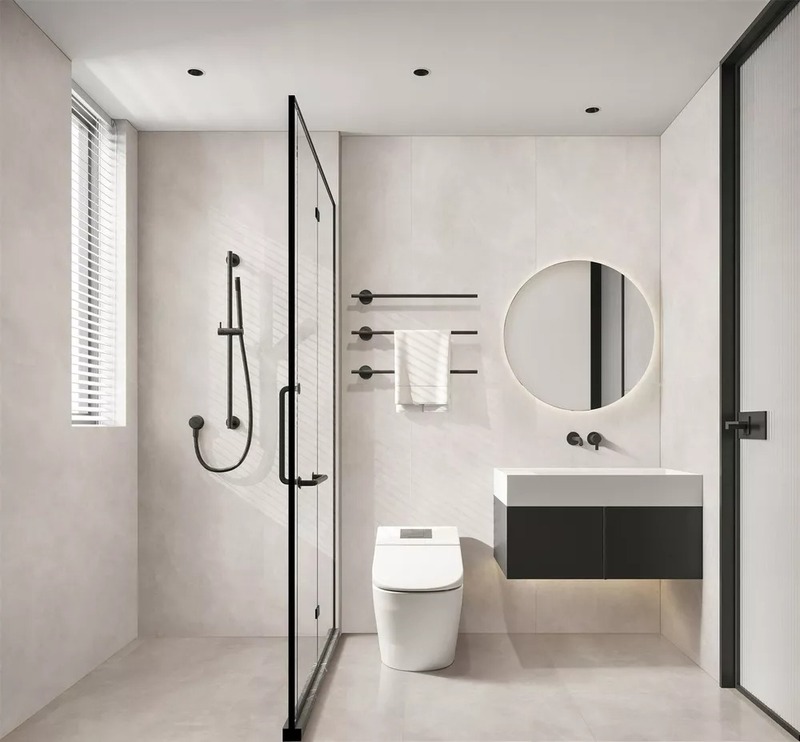 Trong phòng tắm biệt thự, sự tối giản được thể hiện rõ ràng qua việc loại bỏ mọi chi tiết rườm rà. Để sàn và tường luôn giữ được vẻ trống trải, thoáng đãng, các gia chủ thường chọn giải pháp thiết bị âm tường. Nhiều kiến trúc sư còn ưu tiên dùng cùng một loại gạch lát cho cả sàn và một phần tường để tạo sự đồng nhất, liền mạch và sang trọng như bước vào khu suối khoáng nóng cao cấp.