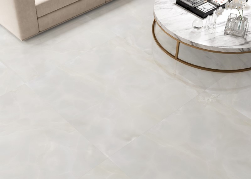 Gạch lát nền vân đá Onyx màu trắng thường sản xuất từ các thương hiệu nổi tiếng như Tây Ban Nha, Ấn Độ với chất lượng xương gạch bền vượt trội, bề mặt sáng bóng dễ lau chùi, vệ sinh.