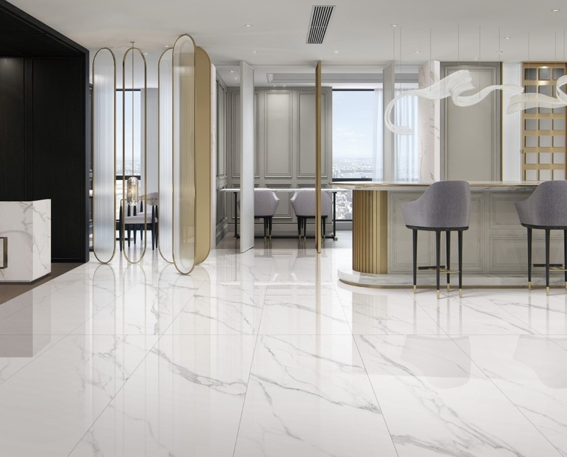 Gạch lát nền vân đá Marble màu trắng được ưa chuộng trong các thiết kế nội thất hiện đại. Các đường vân Marble được thiết kế to bản, mềm mại và có độ loang tự nhiên, mô phỏng chân thực những thớ đá cẩm thạch nguyên khối, được chấm phá có chủ đích, tạo chiều sâu thị giác và cảm giác chuyển động nhẹ trên bề mặt sàn. Nhờ sự cân đối đó, dòng gạch này mang đến vẻ đẹp sang trọng, thanh lịch, đủ để tạo dấu ấn đẳng cấp nhưng vẫn giữ được sự tinh tế, không phô trương.