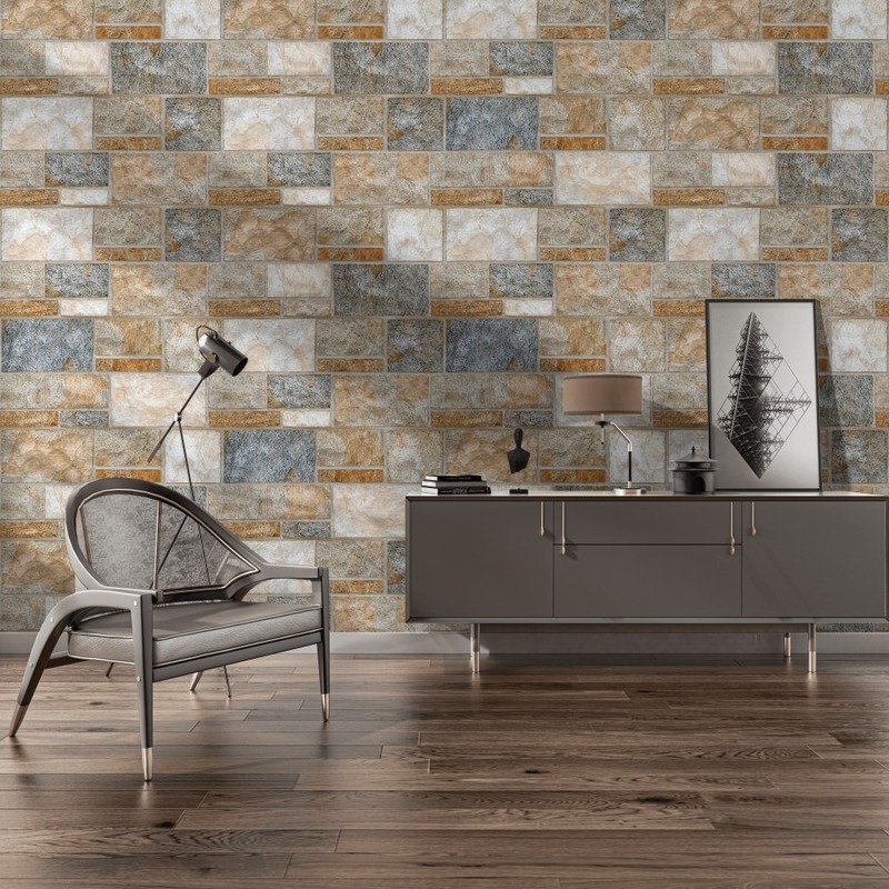 Mẫu gạch giả đá Ấn Độ 30x60, được thiết kế với họa tiết đá ghép tự nhiên đa sắc, xen kẽ giữa các mảng xám nhạt, ghi đậm và nâu đất. Các viên đá được mô phỏng ngẫu nhiên về hình khối, mang lại cảm giác chân thực và tự nhiên như tường đá xếp tay thủ công. Bề mặt gạch có hiệu ứng men matt, có độ sần giúp tăng khả năng chống bám bẩn rất phù hợp cho ngoại thất, tường rào, tiểu cảnh sân vườn hoặc khu vực hồ bơi…