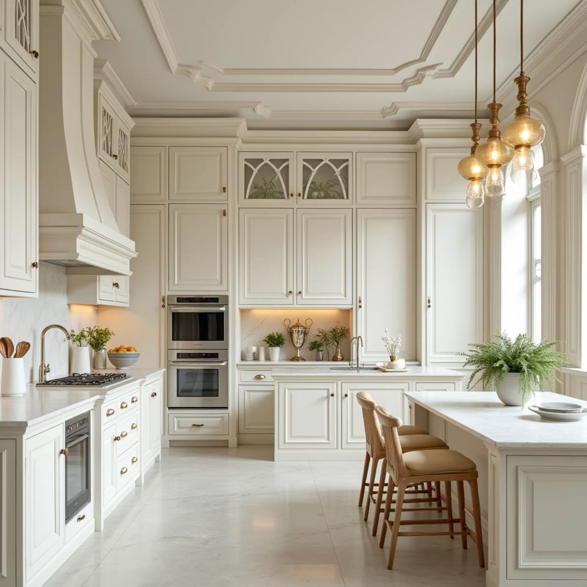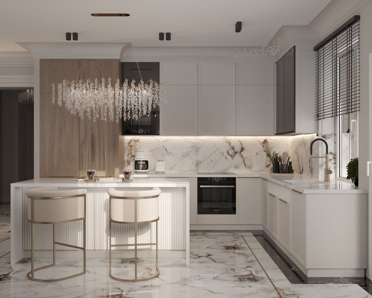 Gạch lát nền phòng bếp theo phong cách Tân cổ điển nổi bật với những tông màu ấm và có tính thẩm mỹ cao. Những gam màu như kem, be đậm, vàng nhạt hay nâu sáng giúp căn bếp trở nên ấm cúng và quý phái hơn. Tuy nhiên, việc phối màu cần được tính toán hài hòa giữa nội thất và ánh sáng để giữ được nét nhẹ nhàng đúng tinh thần Tân cổ điển.