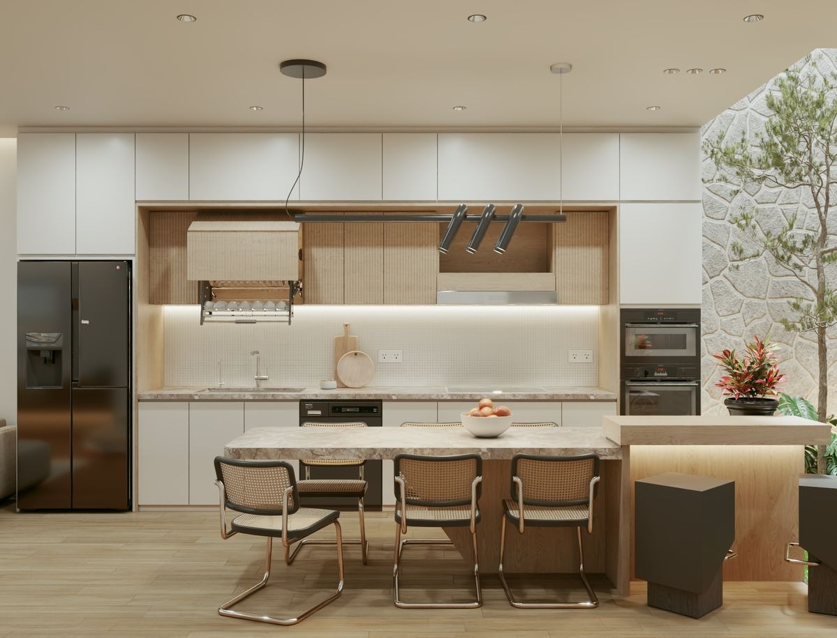 Xu hướng bếp xanh và kết nối với thiên nhiên đang được nhiều gia chủ quan tâm. Không gian bếp được thiết kế mở, tận dụng ánh sáng tự nhiên và bố trí thêm cây xanh, đem đến cảm giác thoải mái, biến phòng bếp thành nơi thư giãn thay vì chỉ là khu vực nấu nướng.