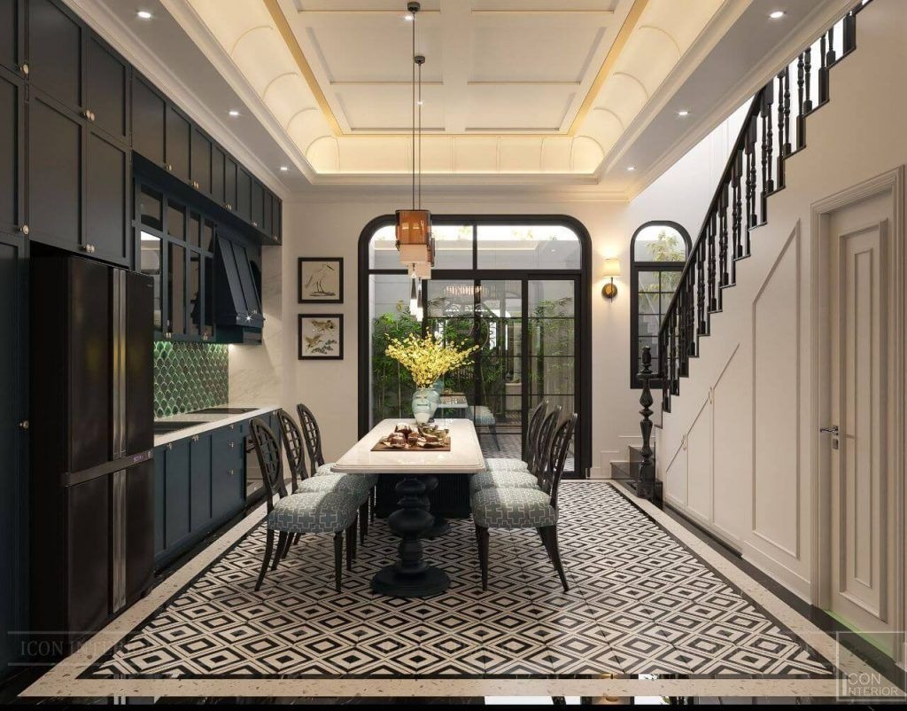 Phòng bếp phong cách Indochine là sự kết hợp tinh tế giữa nét Á Đông cổ điển và chút phóng khoáng của Pháp. Những mẫu gạch bông hoa văn truyền thống luôn là biểu tượng của Indochine, thường được sử dụng để làm nổi bật khu vực bàn ăn hoặc lối đi. Nếu yêu thích nhẹ nhàng hơn, gạch vân gỗ nâu là lựa chọn lý tưởng vì gợi lại cảm giác ấm cúng và sang trọng của kiến trúc xưa.