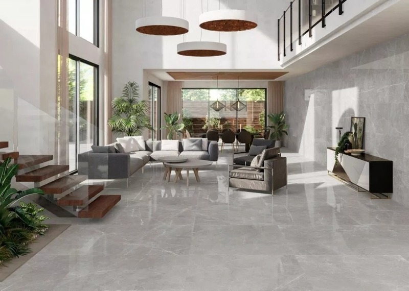 Gạch khổ lớn thường được chọn cho phòng khách rộng và thiết kế trần cao. Ưu điểm là ít đường ron, tạo cảm giác liền mạch, sang trọng và hiện đại. Khi kết hợp ánh sáng tự nhiên, bề mặt gạch càng nổi bật, giúp không gian thêm sang trọng và tinh tế: