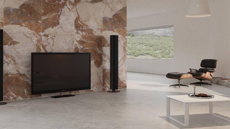 Ở những căn phòng khách lớn của biệt thự hoặc căn hộ cao cấp, gạch khổ lớn mới thực sự phát huy được giá trị. Bề mặt gạch rộng, ít đường ron sẽ làm nổi bật sự liền mạch và tinh tế của cả bức tường: