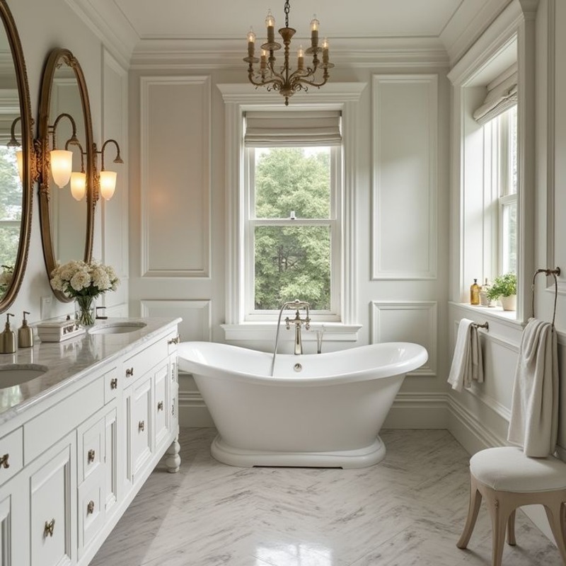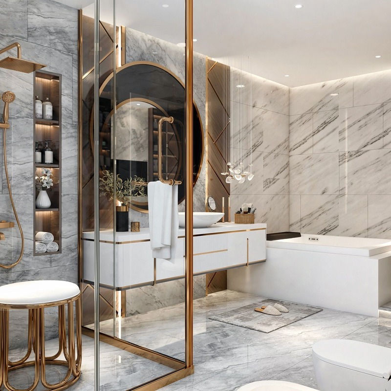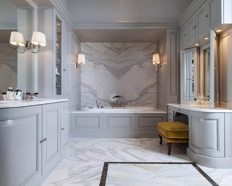 Phong cách Tân cổ điển đề cao sự tinh giản nhưng đẳng cấp, nếu nền phòng tắm đã có vân đá nổi bật, các mảng tường hoặc thiết bị nội thất nên nhẹ nhàng để tổng thể cân bằng. Quá nhiều điểm nhấn sẽ khiến không gian mất đi độ sang trọng cần có.