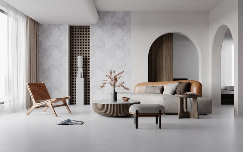 Với không gian rộng, thoáng, đủ ánh sáng, gạch men matt thể hiện rõ ưu thế về mặt thẩm mỹ. Bề mặt mờ giúp không gian nhìn trầm, sang và ổn định, không bị chói lóa như một số trường hợp sử dụng men quá bóng trên diện tích lớn. Đặc biệt, các mẫu gạch men matt vân đá, vân xi măng hoặc vân bê tông rất phù hợp với phòng khách theo phong cách hiện đại, tối giản hoặc Tân cổ điển,...