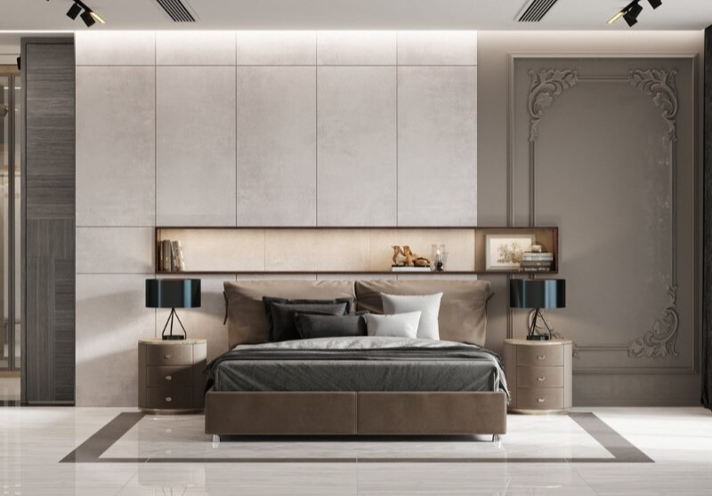 Phòng ngủ lớn từ 15m² trở lên có thể sử dụng gạch ốp tường 60x120cm cho mảng tường đầu giường. Các mẫu vân đá hoặc vân xi măng tông màu ấm giúp căn phòng vừa hiện đại vừa ấm áp, không gây nặng nề.