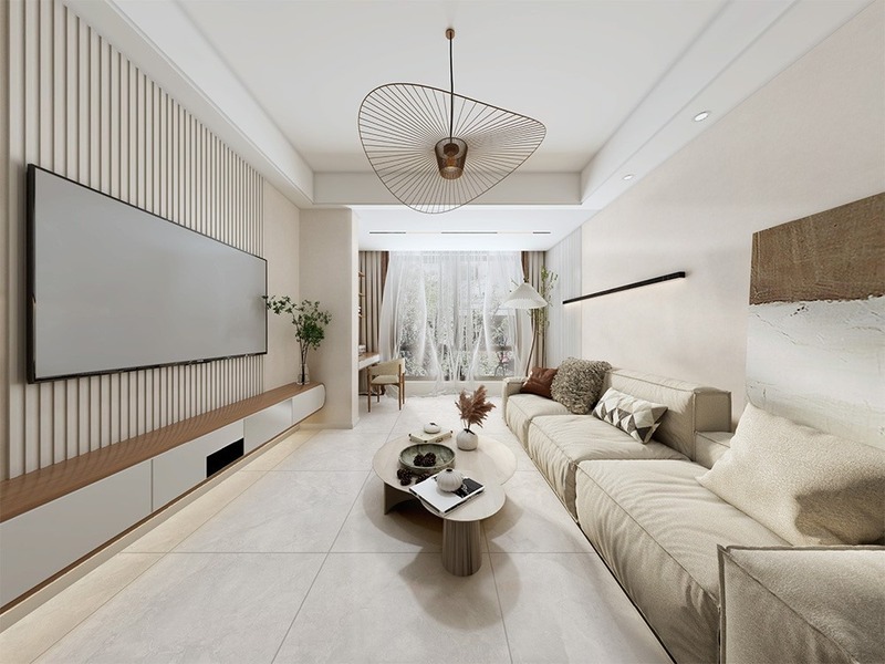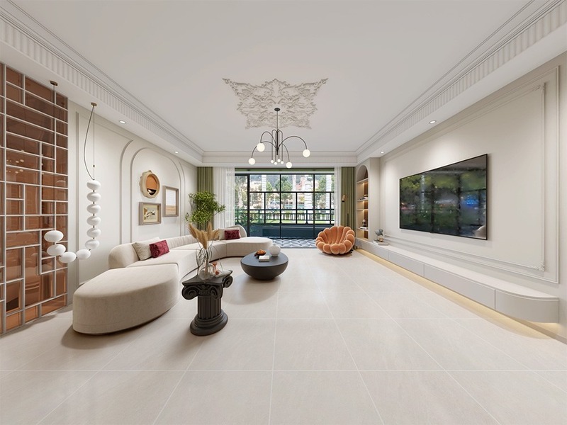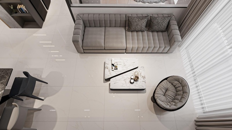 Nếu phòng khách có nhiều ánh sáng tự nhiên hoặc kết hợp nội thất tông ấm, có thể chọn gạch màu xám nhạt, be nâu hoặc vân đá ấm để cân bằng sắc độ. Họa tiết nên chọn dạng vân đá marble, vân xi măng hoặc terrazzo mịn vừa có độ tự nhiên, vừa giữ sự thanh thoát cần thiết. Hạn chế chọn gạch có hoa văn to hoặc quá phức tạp vì làm sàn trở nên nặng và rối.