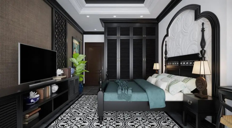 Thông thường, các kiến trúc sư ưu tiên những đường nét mềm mại, họa tiết mang cảm hứng Đông Dương như hoa lá cách điệu, mô-típ hình học nhẹ nhàng…Các họa tiết này giúp giữ được tinh thần giao thoa giữa Á – Âu, đồng thời tạo chiều sâu cho không gian mà không làm phòng trở nên rối mắt. Gia chủ nên tránh các hoa văn quá phức tạp hoặc màu sắc quá đậm vì có thể mất đi sự an yên của phòng ngủ phong cách Indochine.