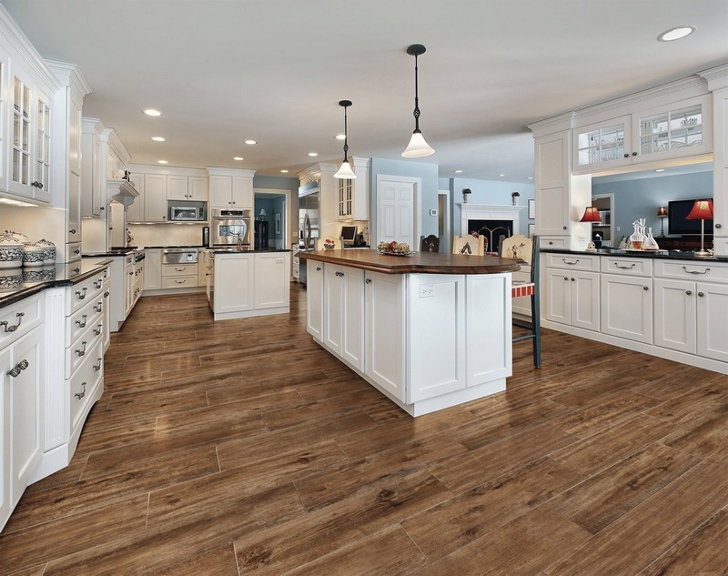 Nền phòng bếp lát gạch vân gỗ mang lại cảm giác ấm cúng và gần gũi mà nhiều gia chủ mong muốn lát để cân bằng với sự xa hoa của phong cách Tân cổ điển. Màu sắc gỗ trầm ấm, mang hơi hướng cổ điển nhưng không lỗi thời. Nhìn vẻ ngoài giống hệt sàn gỗ đắt tiền, gạch giả gỗ lại không tốn công bảo trì, chống nước tuyệt đối, là một khoản đầu tư bền vững cho không gian bếp.