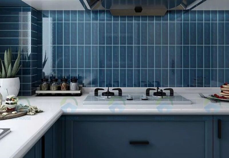 Gia chủ mệnh Thủy nên chọn gạch ốp tường bếp có tông xanh dương, xanh than, trắng hoặc đen ánh xanh, tượng trưng cho dòng chảy và sự linh hoạt. Một số mẫu gạch vân sóng nước, men bóng loang màu xanh ngọc hay xanh navy đều rất hợp để tạo cảm giác mát lành, trong trẻo cho căn bếp.