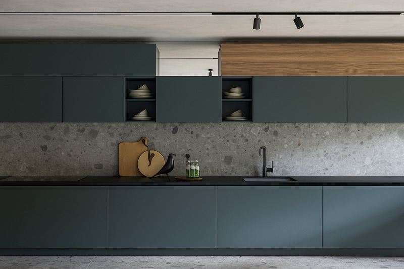 Ngoài ra, tông xám còn rất dễ phối cùng các thiết bị bếp inox hoặc kim loại. Ánh sáng phản chiếu từ mặt thép và bề mặt gạch xám mang lại hiệu ứng sang trọng, chuyên nghiệp như trong các căn bếp châu Âu.