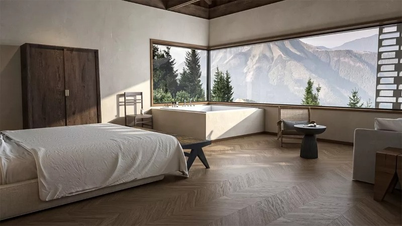 Phòng ngủ lớn trên 18m²: Gia chủ có thể lựa chọn những tông màu gạch lát trầm như nâu đậm, xám đậm hay các màu vân đá tối để tạo chiều sâu và cảm giác sang trọng.