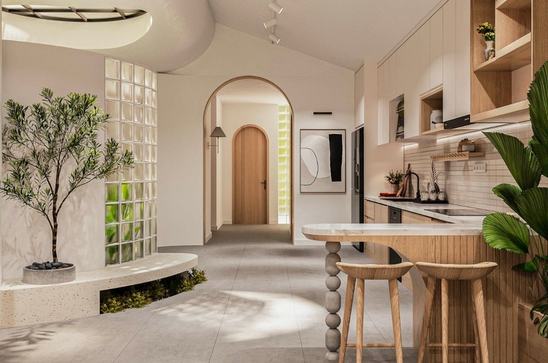 Cây xanh được lựa chọn khi thiết kế nhà nên là những loại dễ trồng, thích nghi tốt với khí hậu nóng ẩm Việt Nam. Việc bố trí cây xanh trong không gian nội thất giúp môi trường sống trở nên trong lành hơn, đặc biệt phù hợp với các khu đô thị đông đúc.