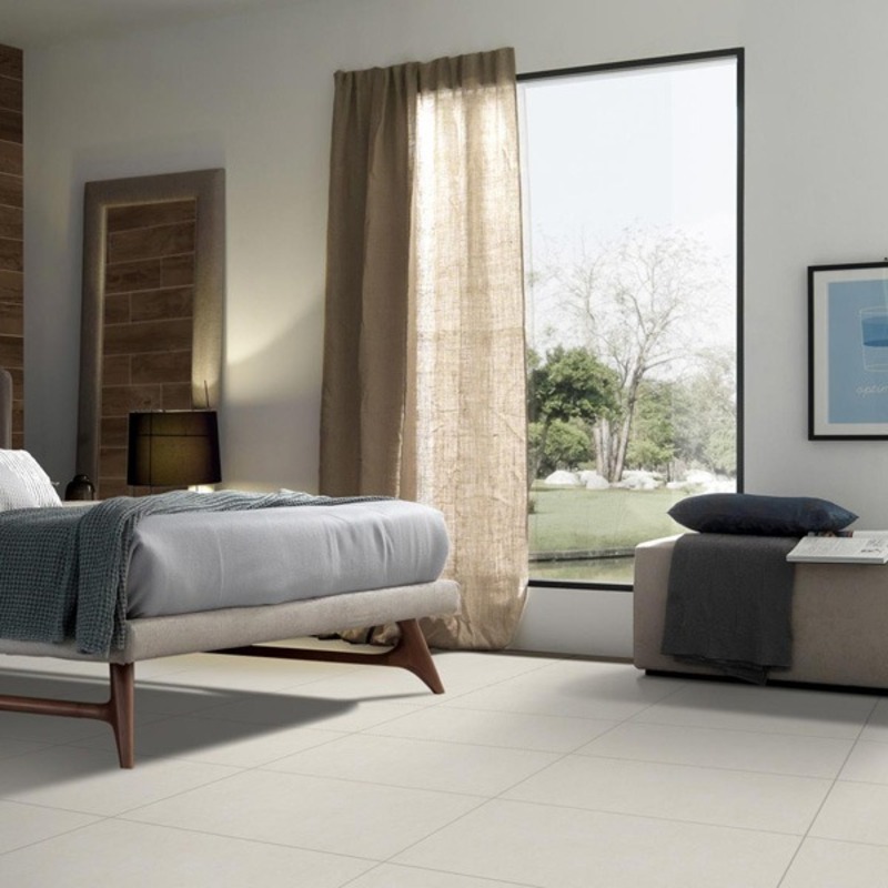 Eurotile 60x60cm với những gam màu nhẹ như be, ghi sáng, vân xi măng đậm sẽ làm nền cho ánh sáng, rèm cửa và giường tủ trở nên hài hòa hơn. Nhờ đó, phòng ngủ mang lại cảm giác thư giãn cho không gian.