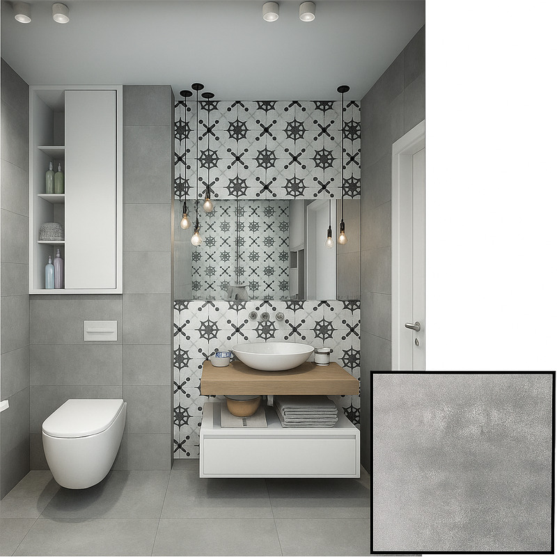 Bên cạnh gạch vân đá màu xám, gạch vân xi măng màu xám chinh phục người dùng bởi vẻ đẹp hiện đại và đậm chất công nghiệp hiện đại. Bề mặt gạch mô phỏng chất liệu bê tông thô mộc, mang lại cảm giác mạnh mẽ, giản dị nhưng vẫn tinh tế. Đặc biệt, gạch xi măng có độ bền cao, khả năng chống thấm hiệu quả, rất thích hợp cho khu vực nhà tắm thường xuyên ẩm ướt.