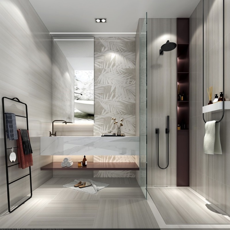 Sự kết hợp giữa gạch vân vải xám HLTQ38006EL và gạch điểm lá cọ cách điệu HLTQ38005EL mang đến hiệu ứng trang trí tinh tế và hiện đại cho phòng tắm. Tông xám trung tính tạo cảm giác nhẹ nhàng, dễ chịu, trong khi họa tiết lá cọ mềm mại giúp không gian bớt đơn điệu, thêm phần sinh động và gần gũi với thiên nhiên.