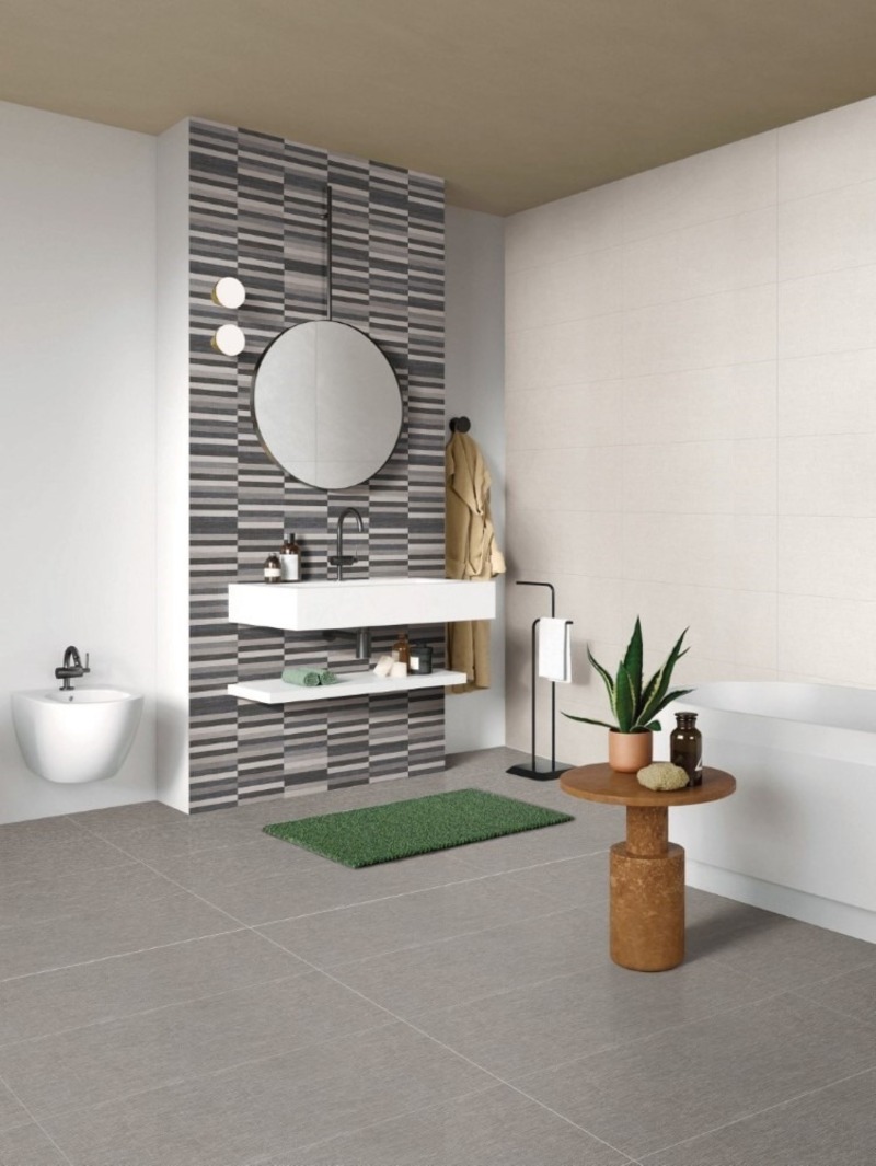 Một phòng tắm đẹp không chỉ phụ thuộc vào mẫu gạch mà còn nằm ở cách phối màu và lựa chọn nội thất phù hợp. Màu xám là gam trung tính, vì vậy chỉ cần khéo léo kết hợp sắc độ và chất liệu, không gian sẽ trở nên hài hòa và có chiều sâu.