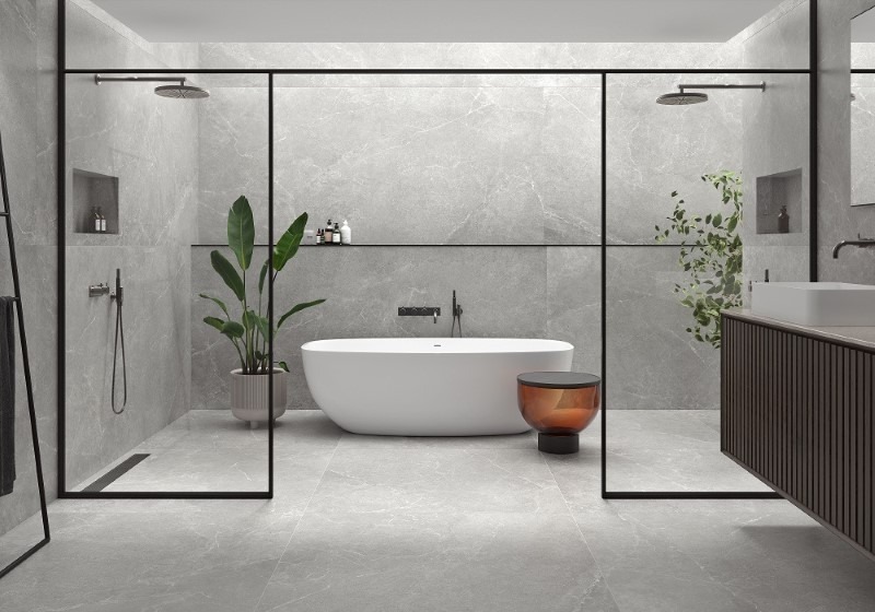 Nếu trước đây màu xám từng bị xem là lạnh lẽo, thì nay nó lại được ưa chuộng vì mang đến cảm giác cân bằng và thư thái. Khi kết hợp cùng các vật liệu tự nhiên như gỗ, kính hoặc đá, gạch ốp nhà tắm màu xám giúp không gian trở nên mềm mại và gần gũi hơn. Các nhà thiết kế cũng ưu tiên sử dụng gạch khổ lớn 60x120 hoặc 80x80, giúp giảm đường ron, tạo cảm giác liền mạch và sang trọng cho căn phòng.