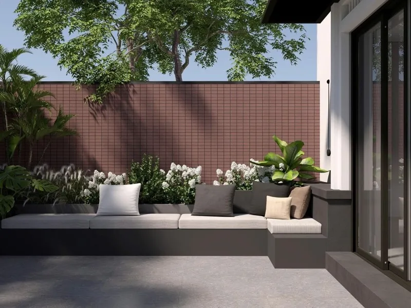 Nối tiếp sự sang trọng hiện đại của gạch đá tự nhiên, gạch lát nền nhà tắm mang hiệu ứng bê tông lát sân vườn cũng đang đứng “top đầu” trong xu hướng thịnh hành 2025. Với bề mặt nhám, sần nhẹ cùng họa tiết nhẹ nhàng, màu sắc trung tính và hiệu ứng tựa bê tông. Dòng gạch này mang lại sự thô mộc, thanh lịch cho sân vườn, đặc biệt thích hợp khi kết hợp cỏ và gạch trang trí cho ngoại thất. Gạch được sử dụng nhiều cho sân vườn biệt thự, resort hay những sân vườn có diện tích rộng.