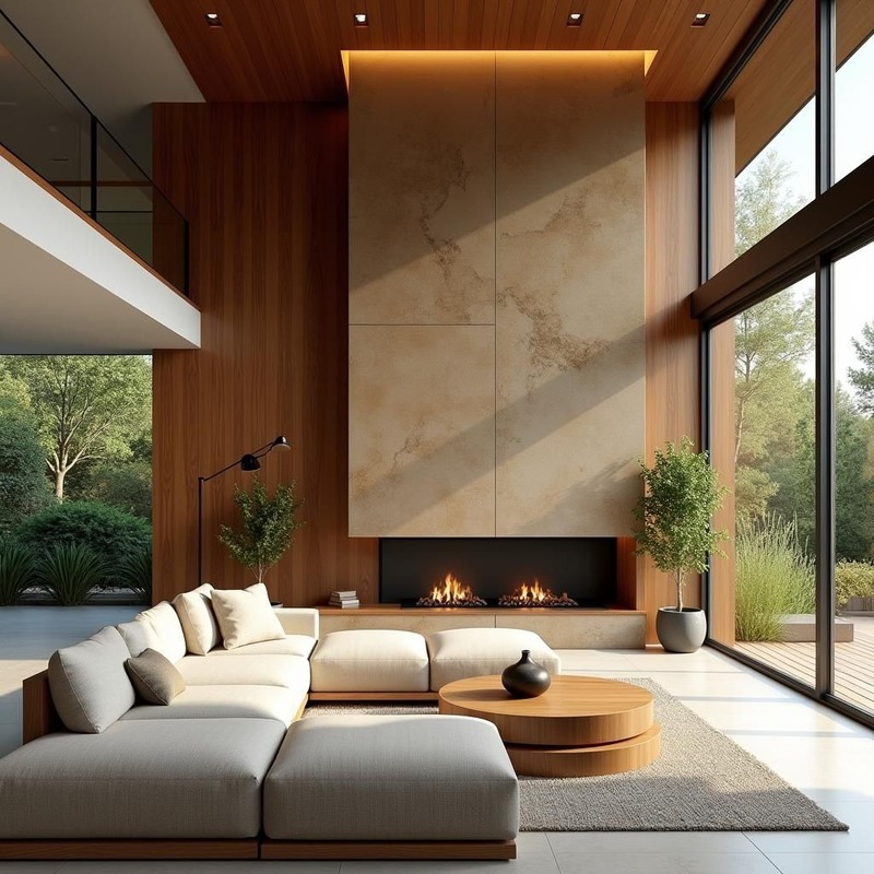 Gạch ốp tường vân gỗ đem đến cảm giác ấm áp, thân thiện và gợi nhắc trọn vẹn tinh thần sống cùng thiên nhiên, một trong những giá trị cốt lõi của kiến trúc Nhật Bản. Những tông gỗ sáng hay hiệu ứng gỗ cháy đều mang vẻ đẹp mộc mạc nhưng tinh tế, tạo nên bầu không khí thư giãn trong phòng khách biệt thự. Bề mặt gạch tái hiện tự nhiên từng đường vân gỗ, giúp không gian trở nên mềm mại, hài hòa, đồng thời kết nối liền mạch giữa nội thất và cảnh quan sân vườn.