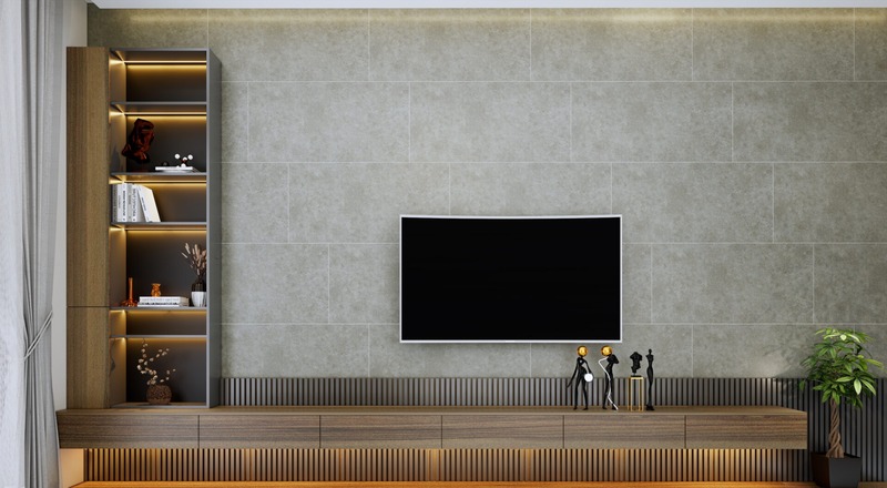 Gạch ốp tường vân xi măng là chất liệu thể hiện rõ nhất tinh thần thiền hiện đại trong thiết kế Nhật Bản. Sự tối giản của bề mặt mờ mịn, lì nhẹ, không chạy theo họa tiết hay hiệu ứng phức tạp, mang đến cảm giác bình yên cho phòng khách. Tông màu xám được ưa chuộng bởi khả năng tạo chiều sâu thị giác mà không gây lạnh, giữ lại sự trầm lắng nhưng vẫn sang trọng của phòng khách biệt thự.
