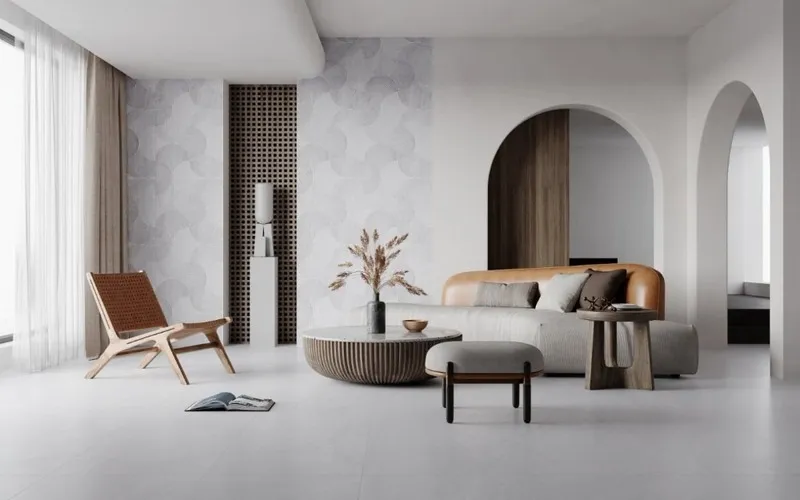 Phòng khách nhỏ dưới 20m²: Ưu tiên sử dụng gạch lát nền 60x60cm hoặc 15x90cm...bề mặt nhám nhẹ màu sắc trung tính như kem, be ngà, ghi nhạt. Gạch trơn màu hoặc vân nhẹ sẽ giúp mở rộng thị giác mà vẫn giữ tinh thần mộc mạc, thư giãn của phong cách này. Nên tránh các mẫu gạch quá bóng hoặc vân gỗ sẫm màu, vì sẽ khiến không gian nhỏ trở nên nặng nề và thiếu sáng.