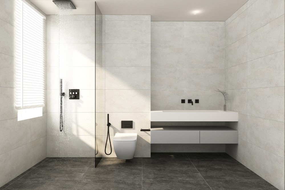 So với dòng gạch Ceramic, chi phí mua gạch Porcelain cao hơn nhưng bù lại độ bền lâu dài và khả năng chống thấm vượt trội. Bề mặt gạch Porcelain phổ biến với nhiều bề mặt men bóng, men matt hay nhám sần,... Đối với sàn nhà tắm, gia chủ nên chọn bề mặt gạch men matt và đạt tiêu chuẩn chống trơn trượt với hệ số từ R10 hoặc R11 để đảm bảo an toàn. Với những gia đình muốn đầu tư lâu dài, gạch ốp lát Porcelain là lựa chọn an toàn trong nhóm vật liệu hoàn thiện nhà tắm.