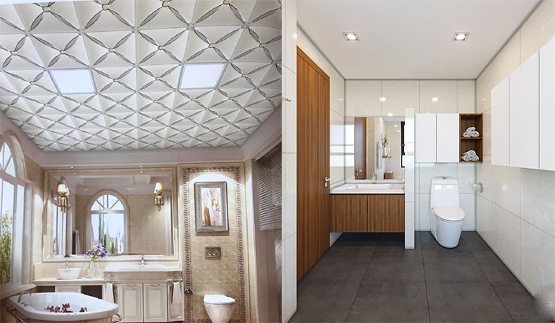 Trần nhôm, trần nhựa có khả năng chống nước tuyệt đối, không cong vênh và không bị nấm mốc. Đây là lựa chọn phổ biến trong các công trình yêu cầu độ bền cao như chung cư, khách sạn hay nhà ở hiện đại,... So với trần thạch cao chống ẩm, trần nhôm có tuổi thọ dài hơn và ít phải bảo trì hơn khi được ứng dụng cho nhà tắm, nhà vệ sinh.